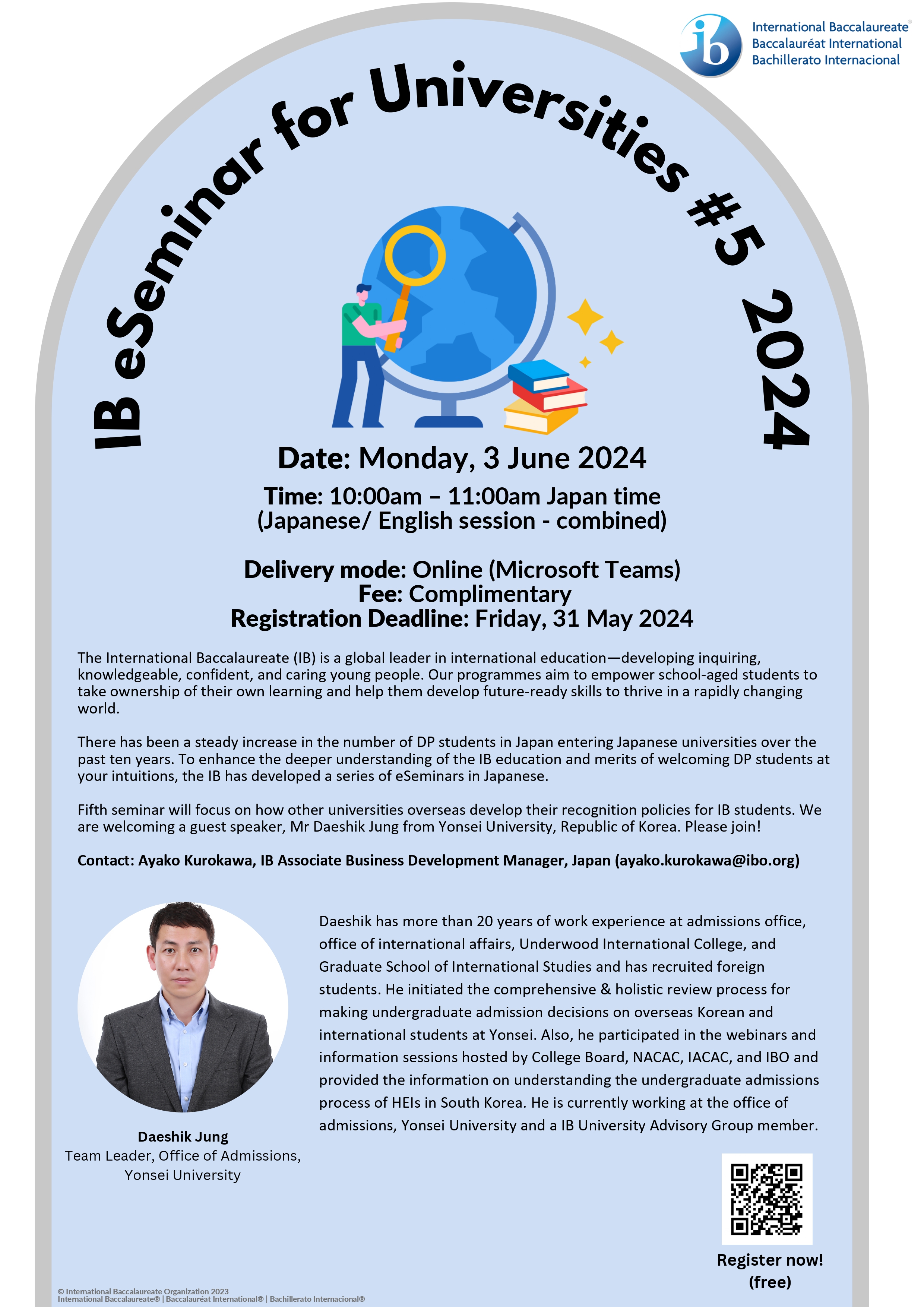 The fifth seminar will focus on how other universities overseas develop their recognition policies for IB students. We are welcoming a guest speaker, Mr Daeshik Jung from Yonsei University, Republic of Korea. Please join!
