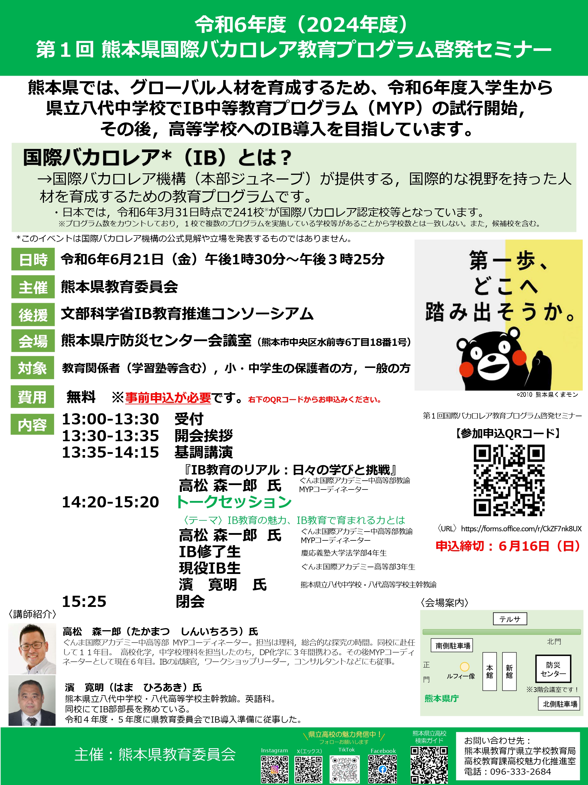 熊本県では、グローバル人材を育成するため、令和6年度入学生から県立八代中学校でIB中等教育プログラム(MYP)の試行を開始しました。その後、高等学校へのIB導入を目指しています。国際バカロレアに関心のある学校関係者、保護者の皆様、ぜひご参加ください。