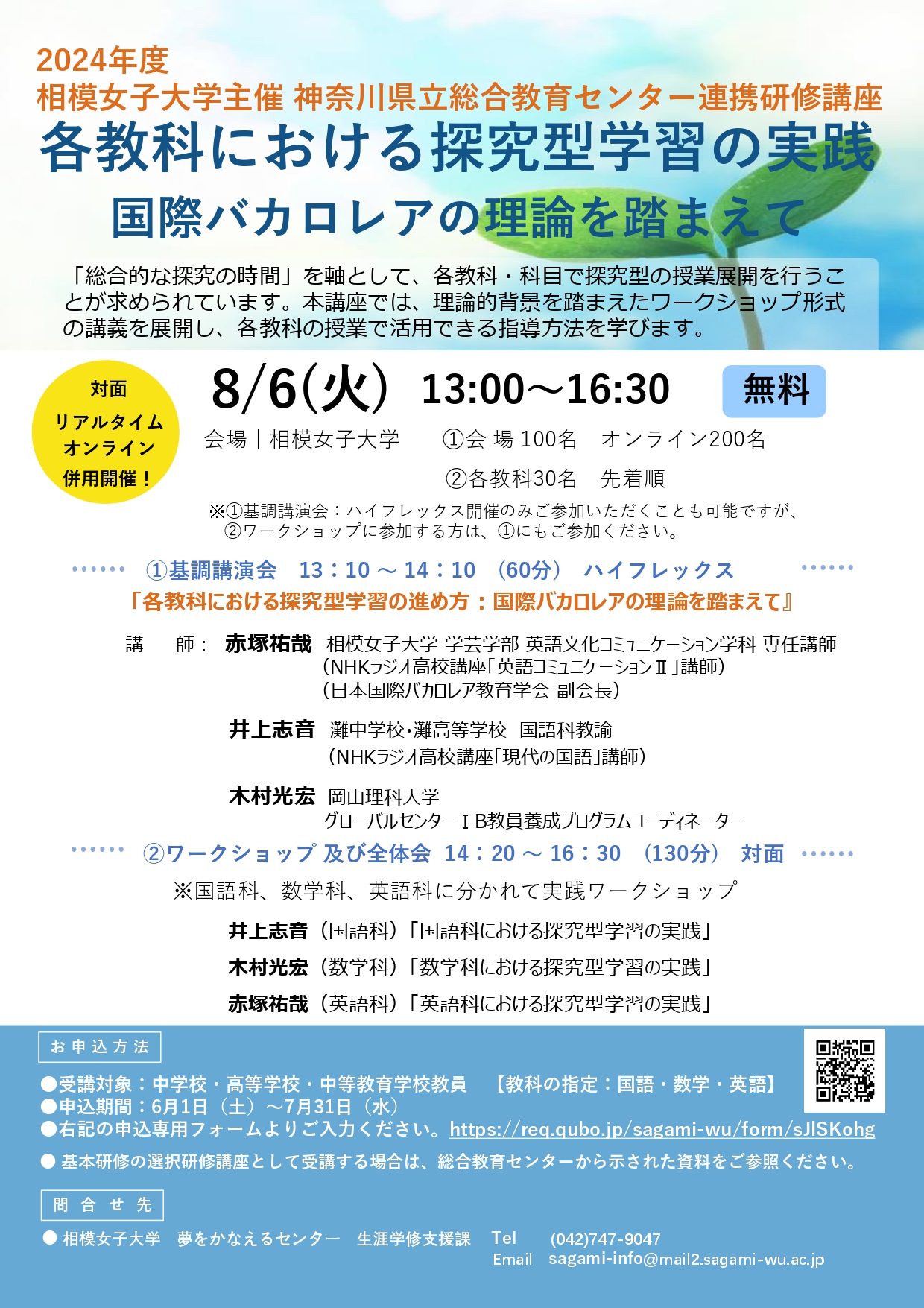 ■会場:相模女子大学 (①会 場 100名 オンライン200名 / ②各教科30名 先着順)