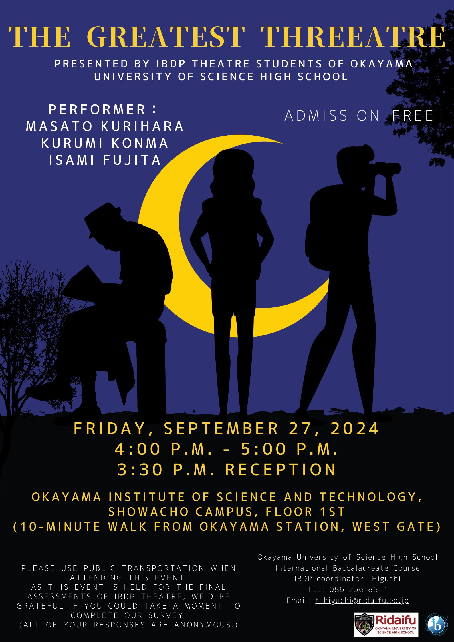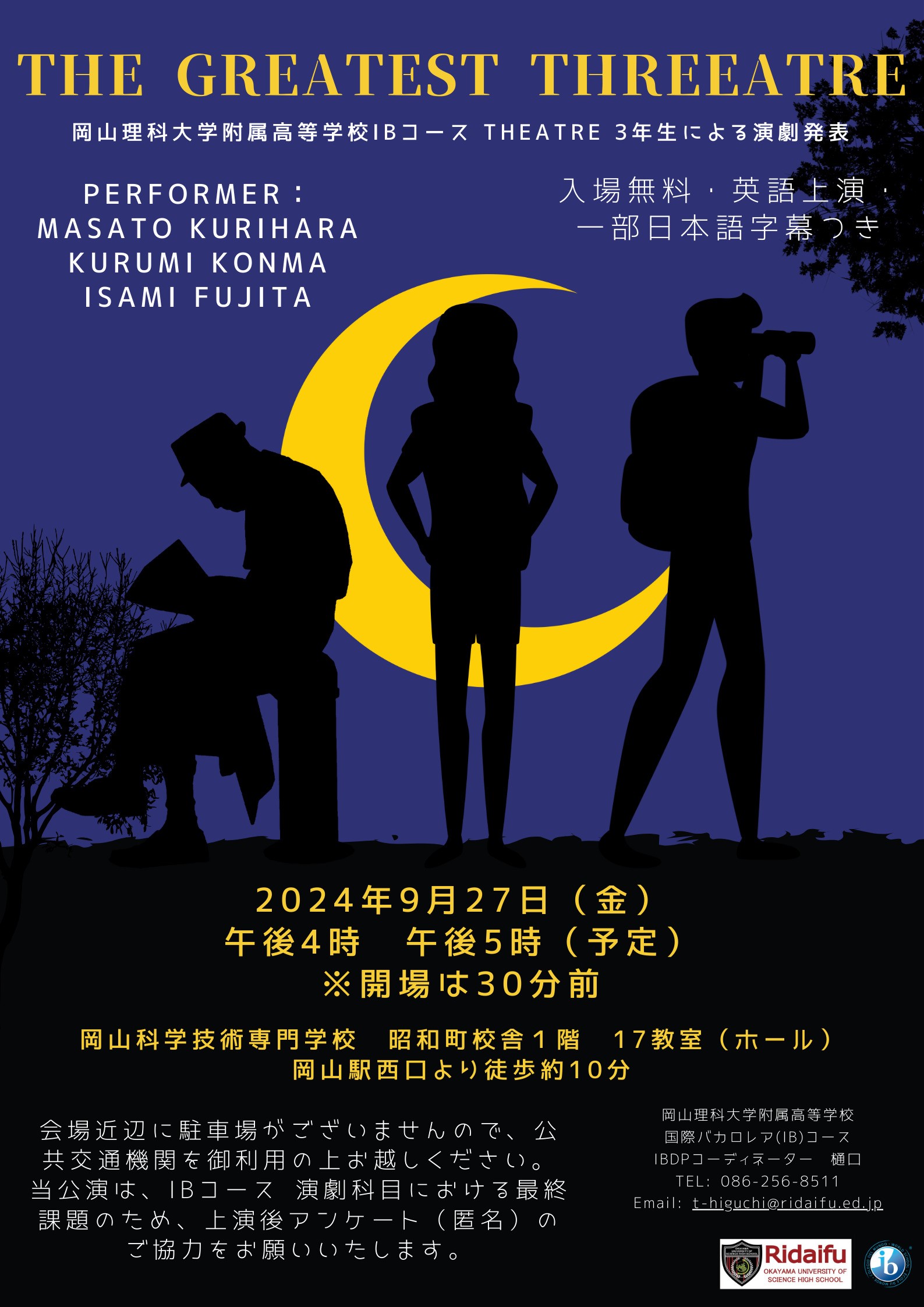 【2024年9月27日(金)】『The Greatest Threeatre-岡山理科大学附属高等学校IBコース Theatre 3年生による演劇発表-』開催のご案内(主催:岡山理科大学附属高等学校)