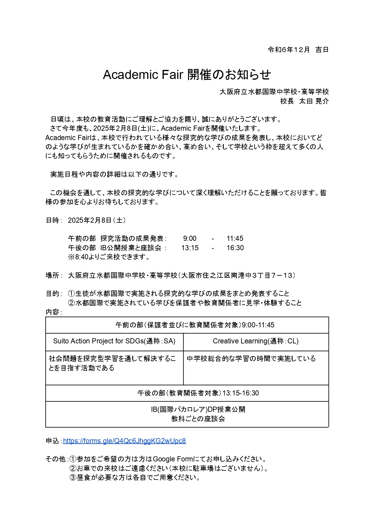 この機会を通して、本校の探究的な学びについて深く理解いただけることを願っております。皆様の参加を心よりお待ちしております。