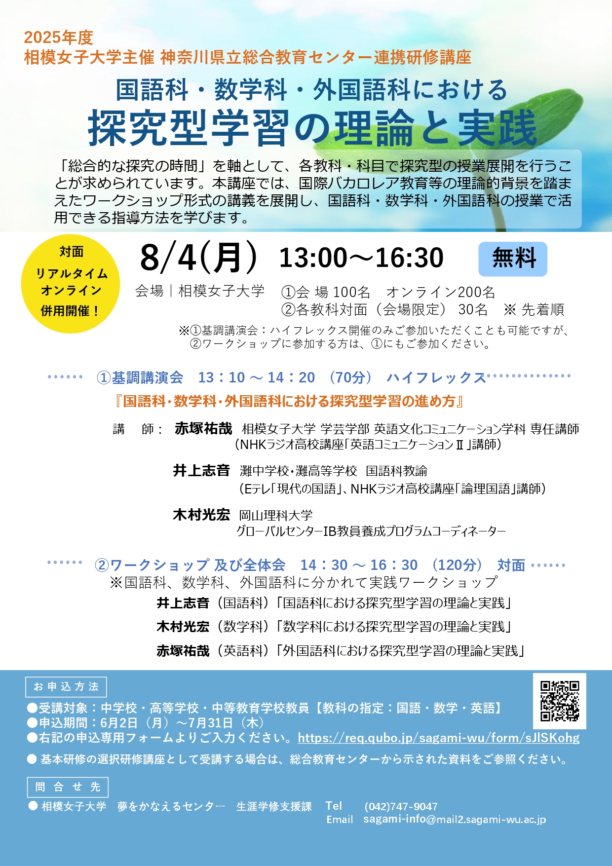 神奈川県立総合教育センターとの連携研修講座「国語科・ 数学科・外国語科における探究型学習の理論と実践」 を開催します。ぜひご受講ください。