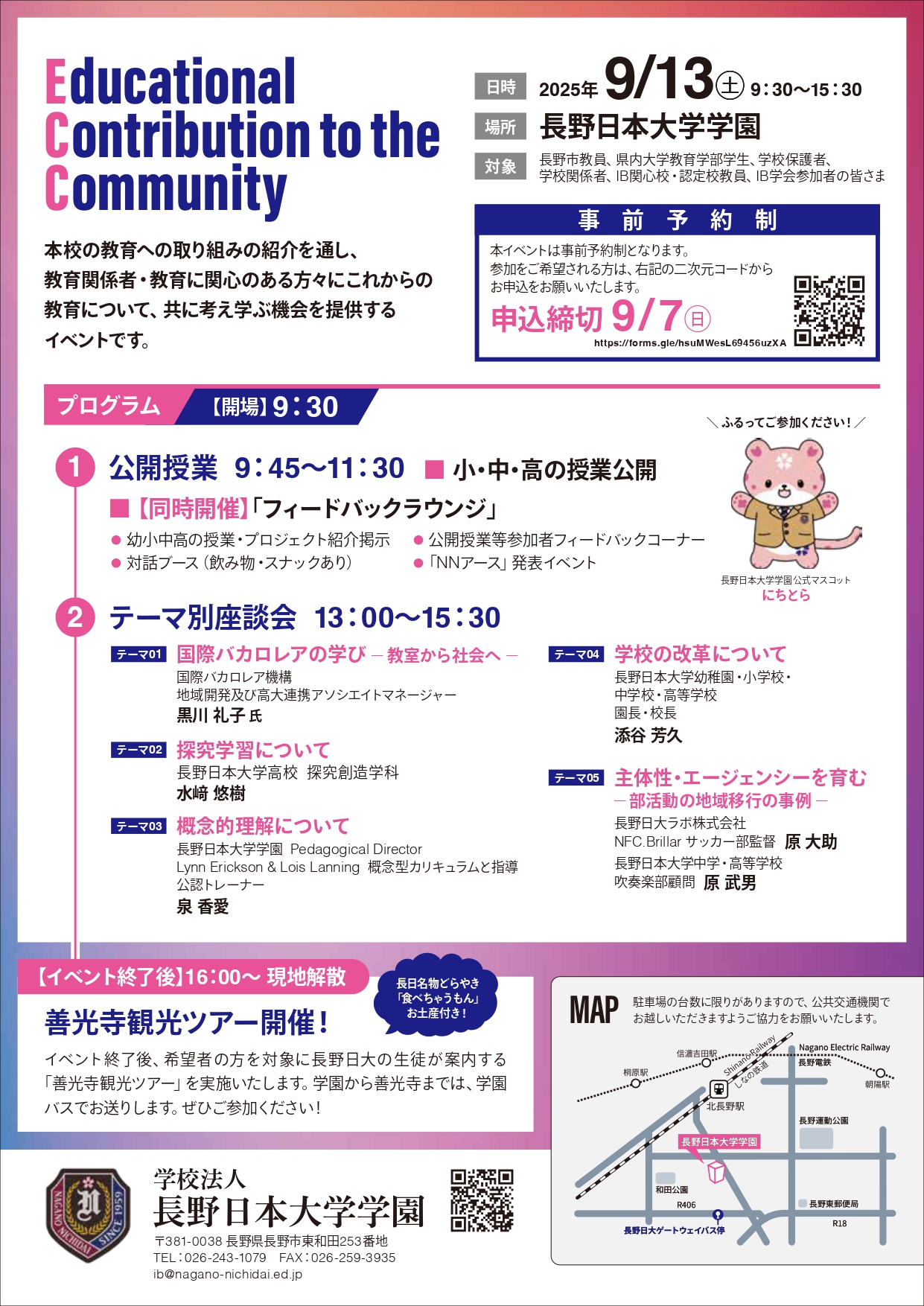 今年度、長野日本大学学園は、幼稚園、小学校、中学校、高等学校全ての学校種において、国際バカロレア(IB)初等教育プログラム(PYP)、中等教育プログラム(MYP)、ディプロマプログラム(DP)、キャリア関連プログラム(CP)の認定校となり、国内初のIBオールプログラム校となりました。私たち長野日大は、IB教育の使命に基づき、教育を通した社会貢献を目指していきます。このたびは本校の教育実践をご覧いただき、教育関係者・教育に関心のあるすべての方々に、これからの教育について共に考え語り合う機会をお届けいたします。ぜひお気軽にご参加ください。