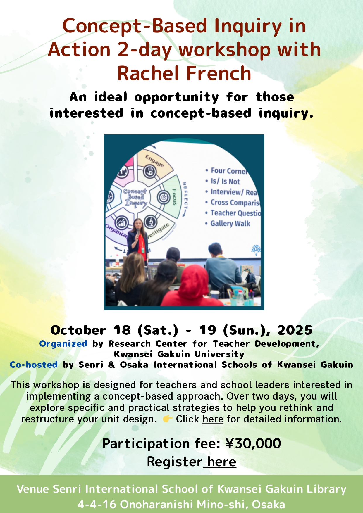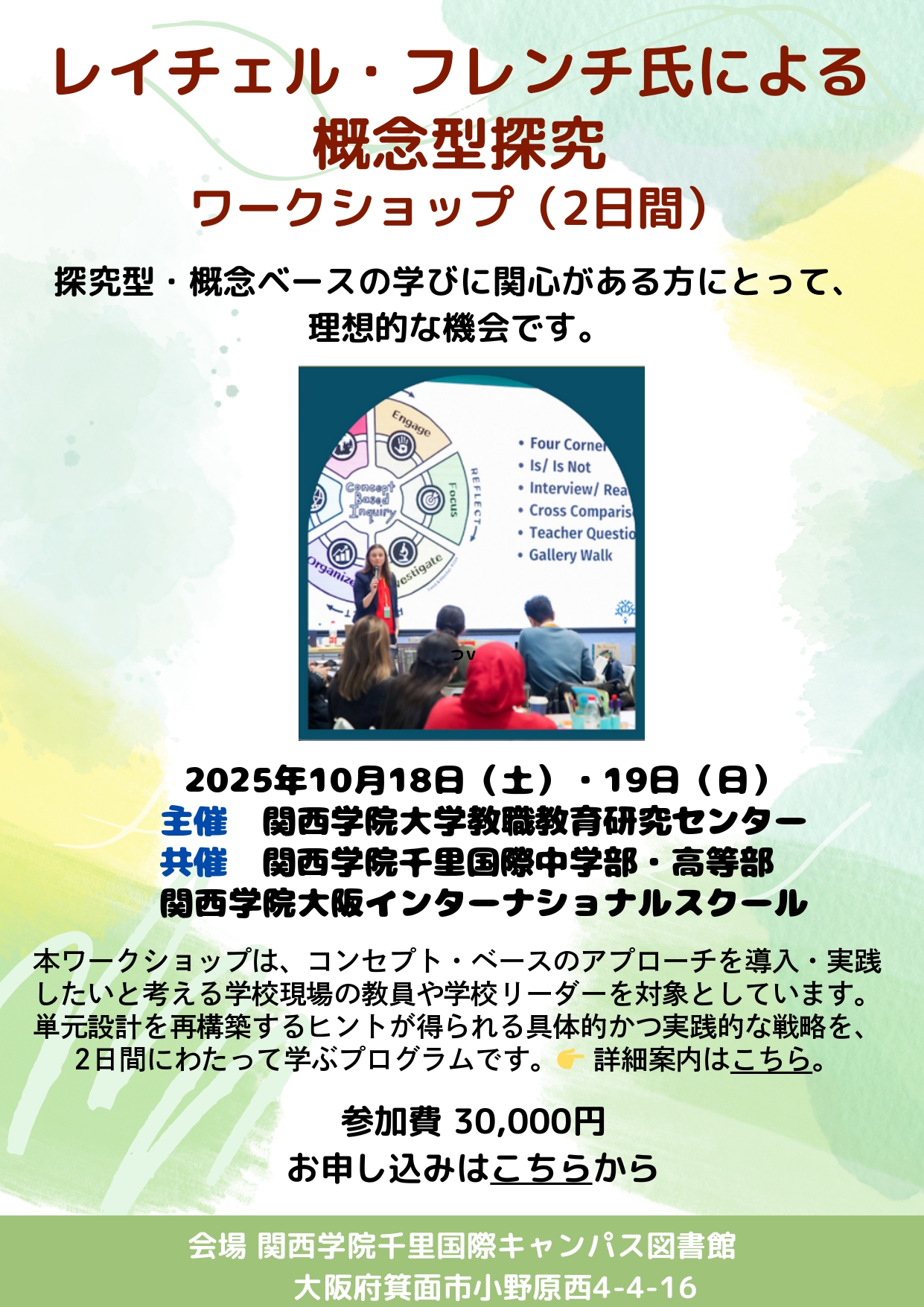 【2025年10月18日-19日】レイチェル・フレンチ氏と学ぶ「探究と概念に基づいた指導」ワークショップ(主催:関西学院大学教職教育研究センター)