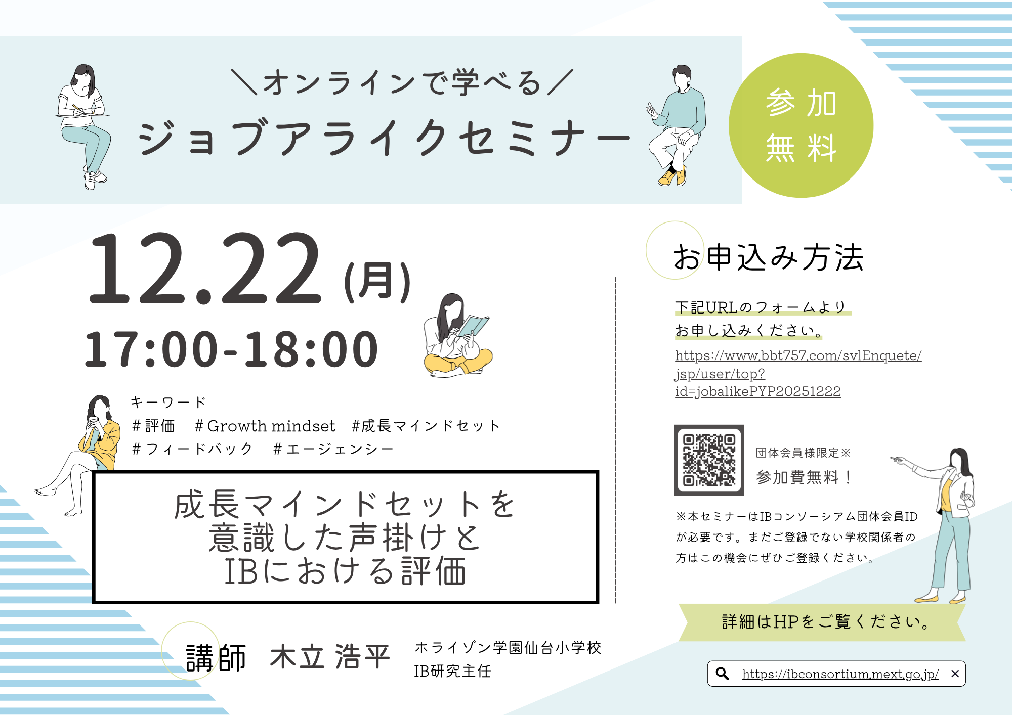 また、IBにおける評価理念と日本の学校文化における評価観との共通点・違いを捉え、今後の授業づくりに生かすヒントを共有します。