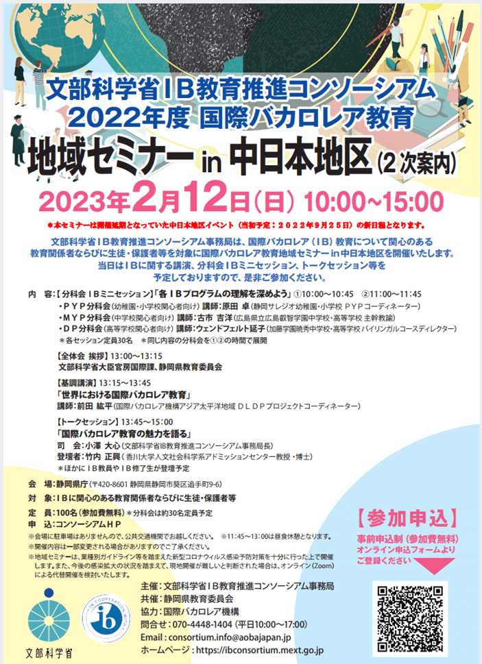 文部科学省IB教育推進コンソーシアム事務局は、国際バカロレア(IB)教育について関心のある教育関係者ならびに生徒・保護者等を対象に、開催延期となっておりました国際バカロレア教育 地域セミナー in 中日本地区を2023年2月12日に実施いたします。当日はIBに関する講演、分科会IBミニセッション、トークセッション等を予定しておりますので、是非ご参加ください。